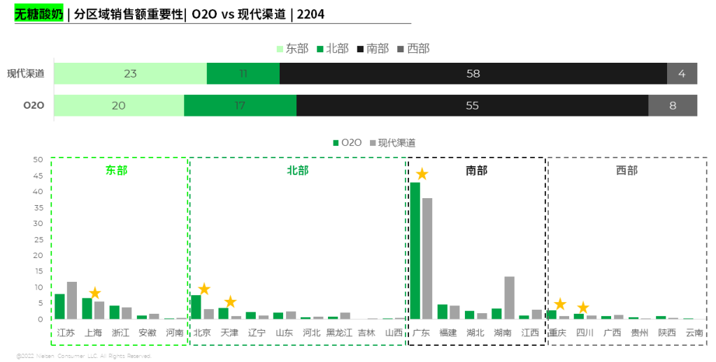 同时,对于产品趋势性的属性卖点在O2O平台上也得到延续和发展 红桃视频,以酸奶品类为例,在消费者日益关注健康的背景下,乳制品作为健康相关品类,无糖概念为市场带来了增长点,而无糖酸奶所展现出来的“健康”“自然”“营养”等特性,也成为年轻,时尚消费者的新宠,而作为线下渠道的延展,O2O平台上无糖酸奶的区域结构与线下现代渠道布局较为相似,进一步剖析省份可以发现,O2O平台上无糖酸奶在经济较为发达,消费水平较高的省份渗透较深,这与O2O平台本身的发展程度也相契合,由此可见,在趋势性的产品细分赛道中,O2O可赋能品牌商助其精准定位,在合适的消费场景把合适的产品送到相应的消费人群手中, 。