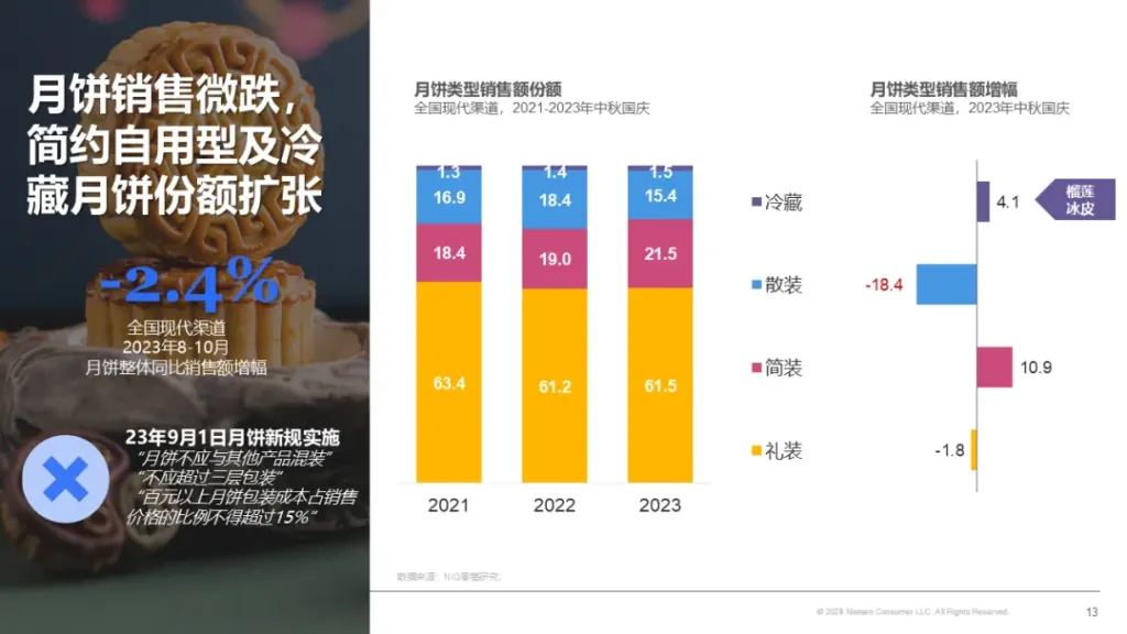 尽管月饼整体略有下滑,但仍中秋节庆最重要的消费品类 红桃视频高清,在经济环境,消费者需求,及国家对于月饼包装的政策引导下,23年中秋平价简装月饼,冷藏月饼引领了品类的增长,而礼装月饼则销售额增速略有下滑。