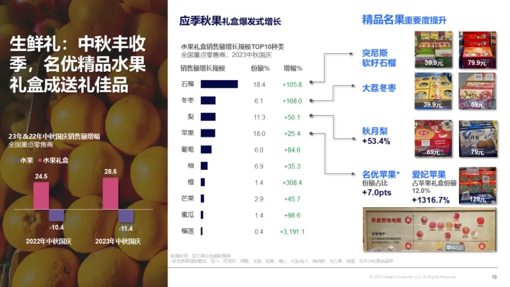 生鲜水果也逐步成为目前节日送礼佳选 红桃影院,中秋恰逢农产品丰收季,应季水果礼盒在23年中秋国庆实现了爆发式的增长,在水果礼盒增长的大背景下,精品名优果种的销售重要性正在持续上升:突尼斯软籽石榴,大荔冬枣,秋月梨等名优产地精品水果礼盒是线下零售商的备货热门,而定位高端的进口爱妃苹果也支撑着价格亲民的苹果礼盒的增长。