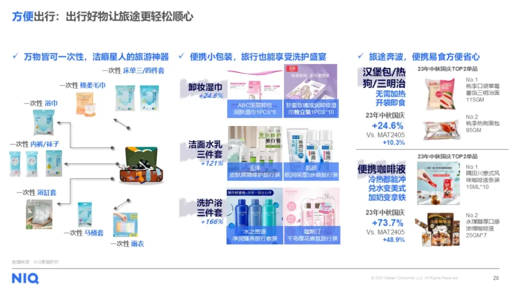 “方便”成为消费者在国庆出行中的首要关键词。随着生活节奏的加快,一次性产品因其便利性受到年轻人的热捧。一次性产品从内裤、性浴巾等传统的一次性品类延展至耐用品中的床单品类,适用于旅游场景的一次性品类实现了再度热销。此外,便携小包装的洗浴护肤用品在23年中秋国庆线下渠道也实现了高速增长。在食品方面,开袋即食的包装三明治面包,以及咖啡液在23年中秋国庆期间表现也优于平日非节假期。
