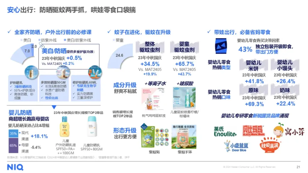 “安心”则是节假期出行的另一关键词,出行旅途中高频使用的防晒、驱蚊产品在23年中秋国庆期间恢复高增长。随着全家旅游的场景逐步复苏,婴童防晒和驱蚊产品也实现了比同品类成人使用产品更高的增速,折射出新一代母婴产品的精细化趋势。