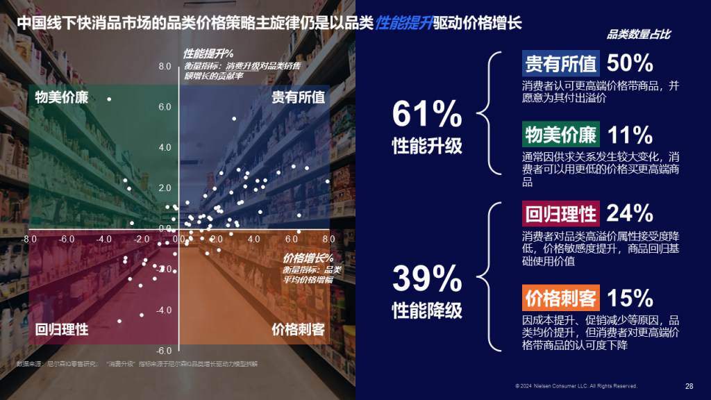 目前中国线下快消品市场的价格策略仍是以品类性能提升驱动价格增长为主,整体消费升级和降级的比例约为6比4,下沉消费市场的崛起是支撑着消费升级的重要力量,而从价格段看,高,低端均向主流价格带靠拢,在口红效应下,相对廉价的大众快消品仍然保留着消费升级的潜力 红桃视频,如冲调健康类和基础个护类产品近期成为产品性能升级代表,企业需要关注消费者对产品性能和价格的平衡需求。