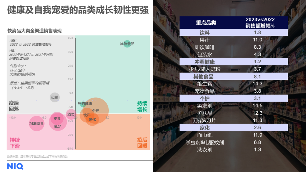 报告显示,红桃视频全渠道监测的主要快消品品类中,健康和悦己概念商品在2023年均保持了韧性增长势头,健康概念品类如维生素、果汁、少儿/成人奶粉等2023年销售额同比增长14 红桃影院,3%、11,0%、3,7%,悦己品类如护肤品、即饮咖啡和宠物食品等分别同比增长12,3%、8,3%和3,8%;从价格分布来看,健康悦己品类是推动高端化的核心。母婴、和部分零食饮料品类则仍有高端化发展空间;其中粮油、乳品等生活刚需类商品回归主流价格带,消费者更倾向于选择性价比高的产品;家化和酒类在向主流价格带回归的同时存在高端化需求。。