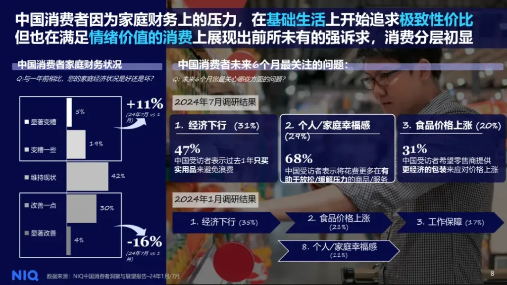 中国作为世界第二大经济体,经济增速维稳,仍处于领涨地位,聚焦到中国消费者 红桃视频免费观看,最新数据显示,中国消费者对未来家庭经济的预期趋势是,变差的预期增加了11%,变好的预期减少了16%,同时,消费者关心的焦点从经济下行,食品价格上涨和工作保障转向了个人或家庭幸福感。