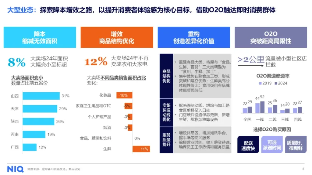 如今,中国快消品红桃视频高清渠道愈发分散,全渠道共生共荣成为关键。不同渠道类型寻求突破边界,实现拓展扩张。例如,大型业态通过缩减无效面积、商品结构优化等调改措施降本增效,提升消费者体验感;并通过O2O模式突破距离局限性,使之成为大型业态触达即时消费群体的重要途径。大卖场调改后的品牌结构呈现新兴本土品牌崛起的趋势,传统大品牌受到挑战。同时,调改后各品类销售额翻倍增长,其中食品饮料品类带动明显。