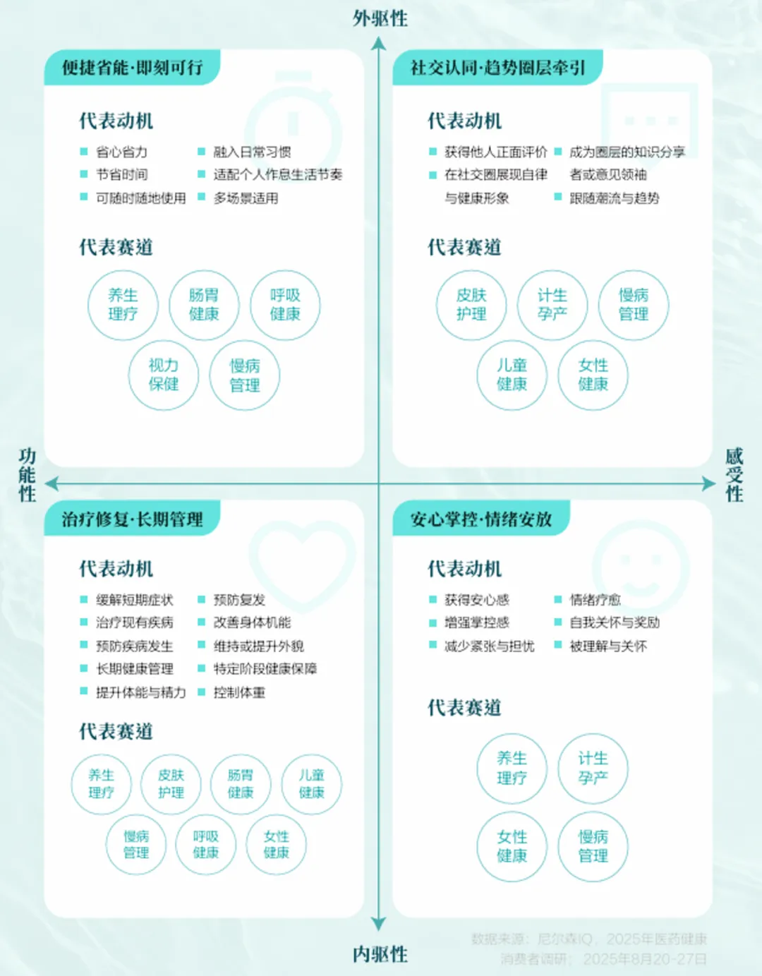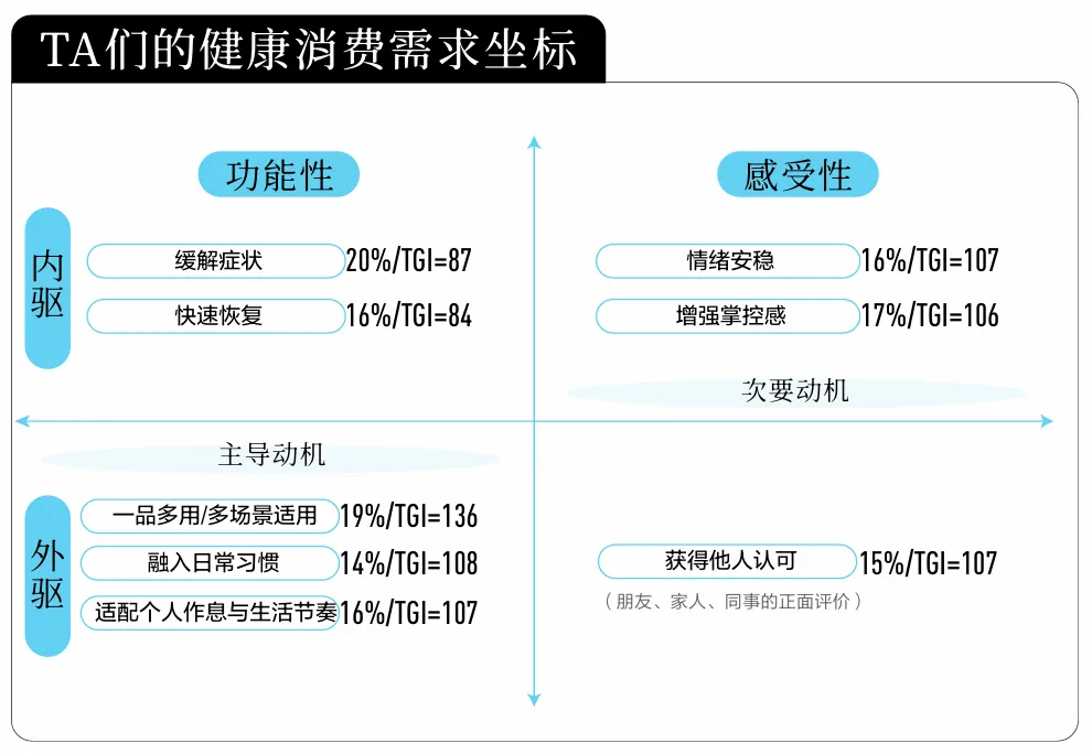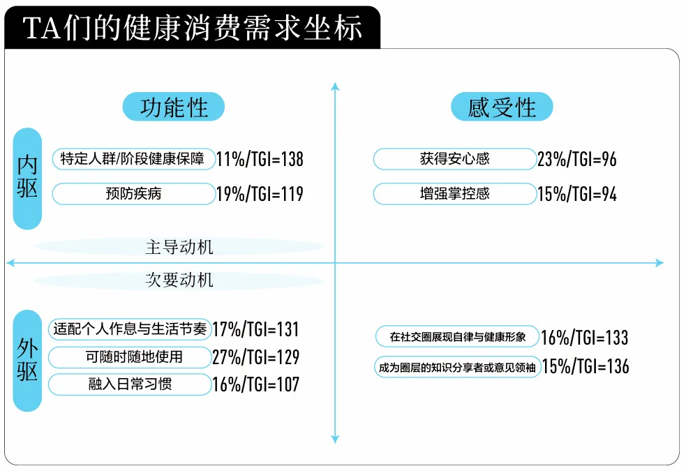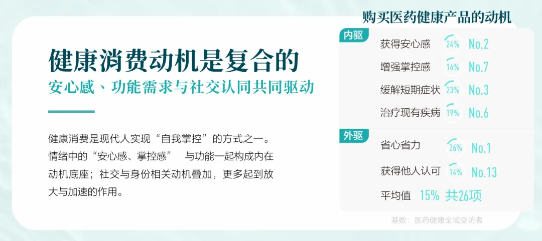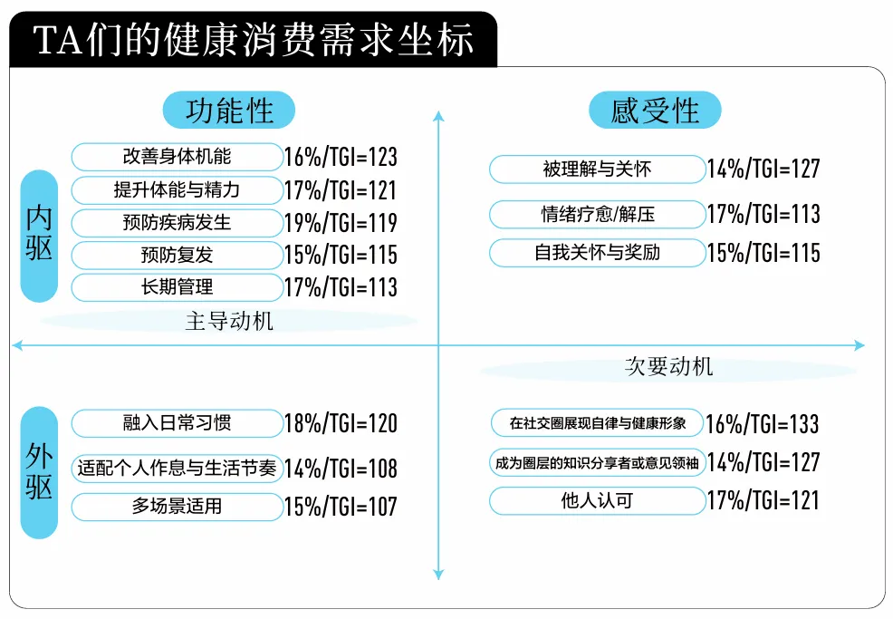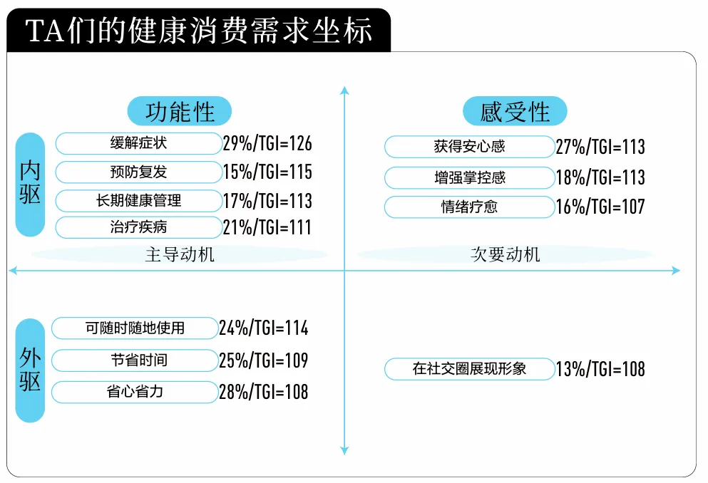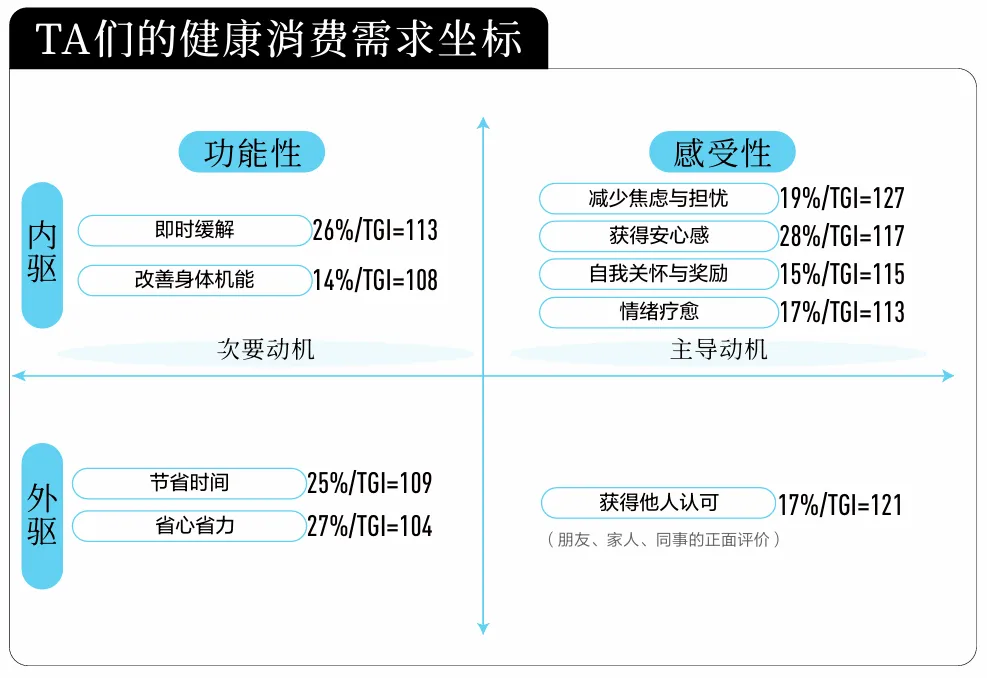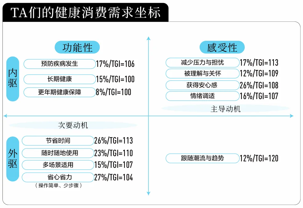 白皮书将以上驱动因素进一步归纳为四重动机:“治疗,预防,维持”的功能动机,“减少担忧,获得确定性”的效率动机,“身份表达与群体归属”的社交动机与“提升生活质量”的意义动机,四重动机如同涟漪层层扩散,既包含最基础的功能需要 红桃视频高清,也卷携着心理安慰,社交认同与未来憧憬,构成消费行为的真正动力, 。